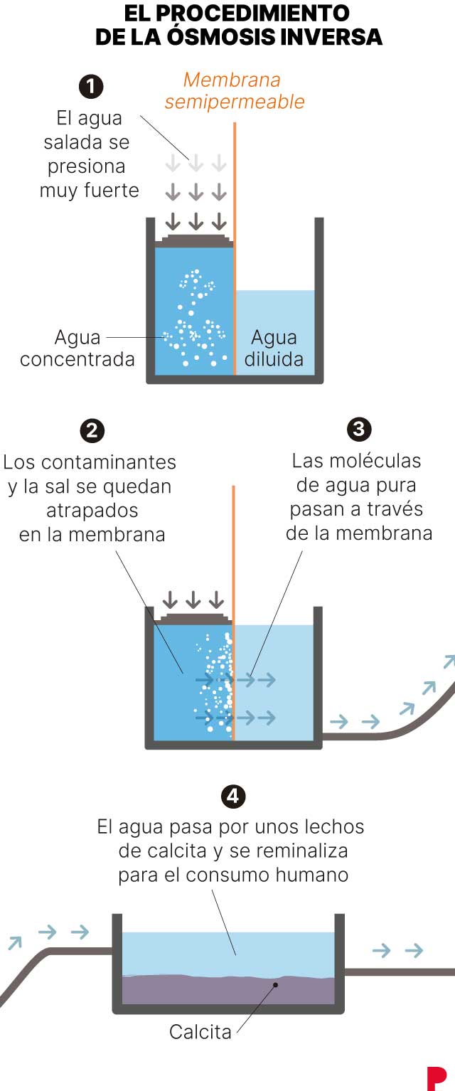 La solution du transport de l'eau par bateau depuis Sagonte Cette solution n’a pas convaincu le ministère de l’Action climatique car elle ne fournissait pas suffisamment d’eau et c’était une option coûteuse, même si elle serait financée à moitié par le gouvernement. En revanche, cette usine de dessalement, achetée itinéraire de secourssera prêt environ dans octobre et produira 40 000 m3 d'eau par jourqui entrera dans les réseaux d'approvisionnement par les canalisations portuaires, déjà prêtes en cas d'arrivée des navires.