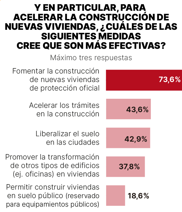 Comme c’est la solution la plus demandée, l’étude a remis en question les personnes interrogées pour les mesures les plus efficaces pour accélérer la construction de nouvelles maisons. Et la plupart dans ce cas sont plus énergiques: trois Espagnols sur quatre (74%) exigent que la construction de nouvelles maisons de protection officielle (APV) soit promue. Ils sont suivis comme des options pour accélérer les procédures dans la construction (44%), libéraliser le sol dans les villes (43%) et favoriser la transformation en maisons d’autres types de bâtiments, tels que les bureaux (38%). Seulement 19% parient sur le fait de permettre aux maisons d’être soulevées sur la dotation publique, qui est réservée aux équipements publics.