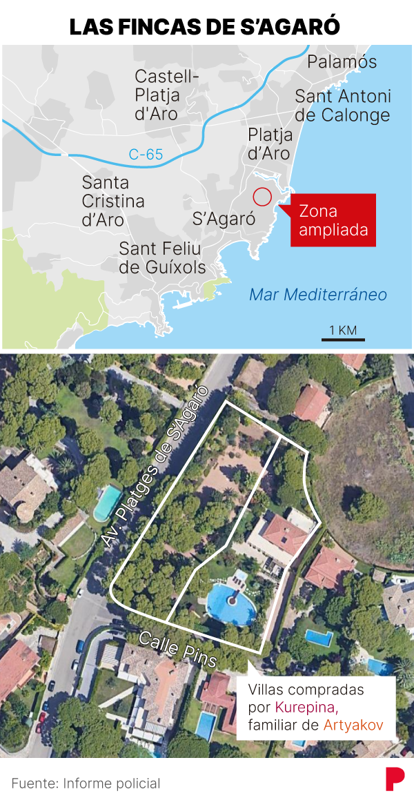Une fois les fonds reçus en Espagne, la famille Artyakov a acheté les fermes de Gérone, à S’agaró (Castell-Platja d’Aro) qu’Anna Kurepina a finalement vendu la Russie en 2014 à son petit-fils Dmitry Artyakov pour 3 560 000 euros de moins. Ce paiement supposé, dont la véracité doute de l’UDEF, a été effectuée à partir d’une banque d’État sanctionnée pour financer des projets militaires russes.