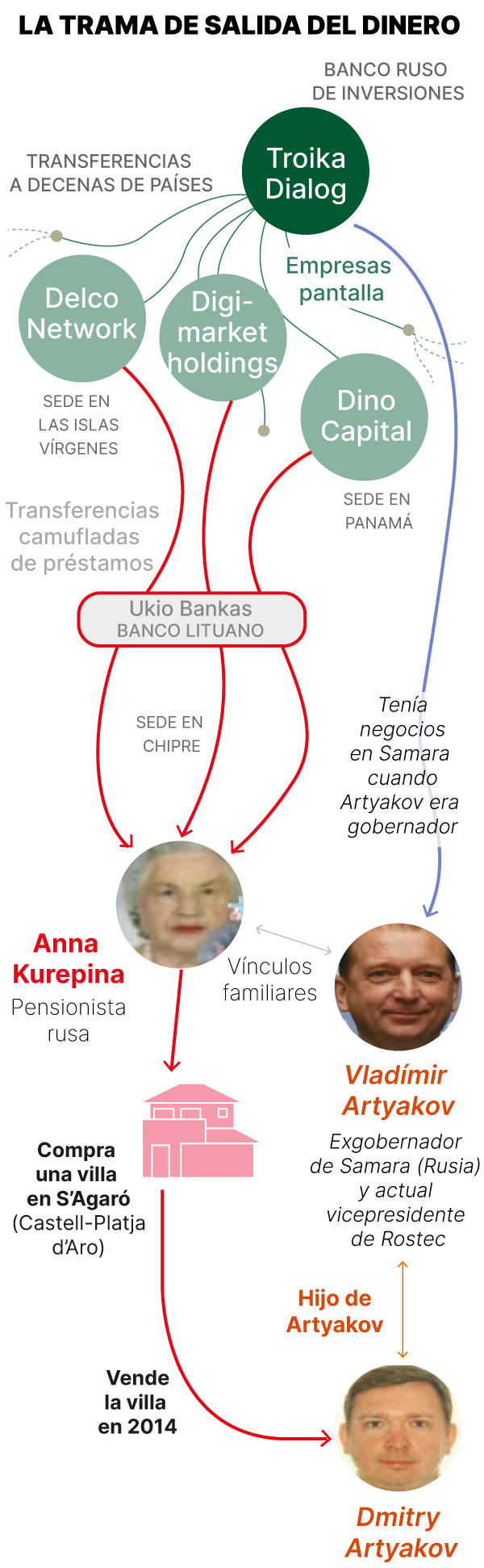En plus de la compagnie susmentionnée de co-réseaux, créé dans les îles Vierges britanniques, deux autres sociétés « fictives », le Panamanian Dino Capital SA et la Laundromat de Digimarket (Lavandería Troika) a fait des transformations de la banque espagnole de l’Artyakov. La contrôle et a fait l’objet d’une utilisation de Dmitry Artyakov, qui, selon la police, a utilisé sa vieille grand-mère « comme écran pour couvrir le nom de son petit-fils », qui était le véritable détenteur, propriétaire et directeur des fonds de la même chose. «