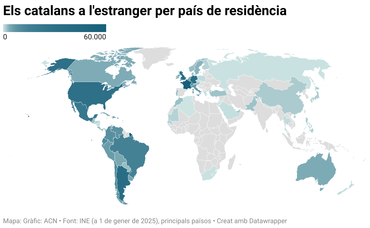 Selon le registre des habitants résidents à l’étranger au 1er janvier 2025 de l’INE, 65% des citoyens des résidents d’origine catalane à l’étranger sont en fait nés en dehors de la Catalogne, le pourcentage le plus élevé au moins depuis 2009.