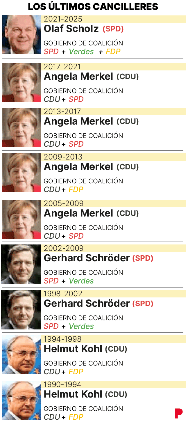 Le contrôle des élections fédérales en Allemagne 2025 a confirmé la victoire claire de la CDU conservatrice de Friedrich Merz et la forte croissance de l’extrême droite de Alternative pour l’Allemagne (AFD), qui est parlé à la deuxième position avec le meilleur résultat de l’histoire. Au lieu de cela, le SPD du chancelier jusqu’à maintenant Olaf Scholz Il a subi une forte débâcle qui s’enfonce à la troisième place et correspond à son pire dossier électoral, mais il sera essentiel dans la gouvernance car la seule somme qui atteint 316 sièges de la majorité absolue du Bundestag sans compter sur les ultras est une grande coalition entre les entrepôts entre les entrepôts entre les ultras entre la coalition entre les entrepôts entre les ultras entre la coalition entre les entrepôts entre les ultras entre la coalition entre les ultras entre la coalition entre les ultras entre la coalition entre les ultras entre les ultras entre la coalition entre la coalition entre les ultras entre la coalition entre les ultras entre la coalition entre les ultras entre les ultras entre la coalition entre les ultras entre les ultras entre la coalition entre les ultras entre la coalition entre les ultras entre les ultras entre la coalition entre les ultras entre la coalition entre démocrates et sociaux-démocrates.