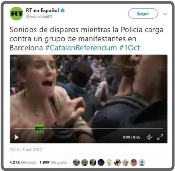 Le rôle des « robots » dans cette présence surdimensionnée de RT en espagnol, dans une affaire de politique intérieure espagnole avec un intérêt relatif pour l’Amérique latine, où se trouve la majeure partie de son audience, est confirmé dans un article publié en novembre 2017 dans « The Washington Post » : « Tout indique clairement que 84 % des grands comptes qui diffusent systématiquement et massivement (des contenus RT et Spútnik) sont très probablement des ‘bots’ numériques. »
