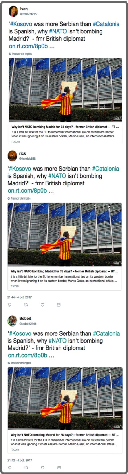 Durant les jours précédant et suivant la consultation, dans l’espace d’une dix joursces trois comptes répartissent chacun un total de 139 contenus fait par RT et Spoutnik, qui a généré une polarisation dans la société catalane. Parfois, il s’agissait de tweets aux termes identiques, comme par exemple les reproductions d’un article de William Mallison, commentateur dans l’orbite du Kremlin, invitant au bombardement de Madrid par l’OTAN. « Le Kosovo était plus serbe que la Catalogne n’est espagnole, pourquoi l’OTAN ne bombarde-t-elle pas Madrid ? » (Le Kosovo était plus serbe que la Catalogne n’est espagnole, pourquoi l’OTAN ne bombarde-t-elle pas Madrid ?), lit-on mot pour mot dans les trois publications.