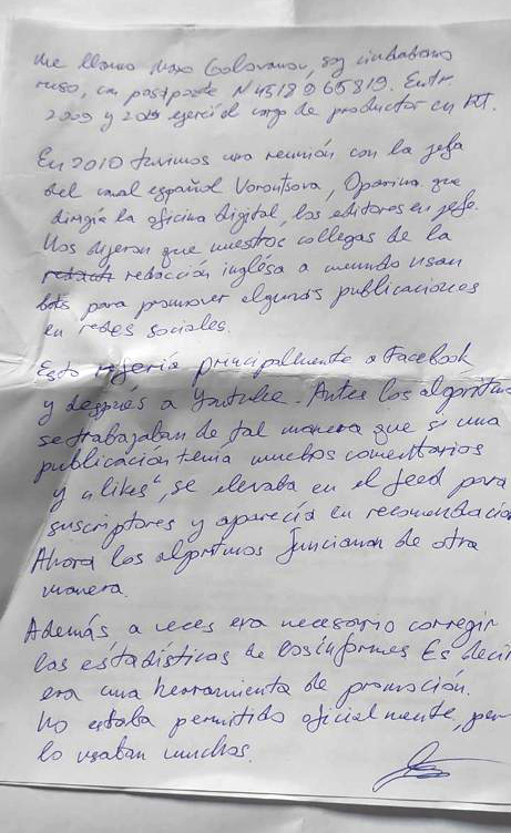 Il recourir à des comptes automatisés sur RT en espagnol remonte à une date bien antérieure aux mobilisations en Catalogne en 2017, selon d’anciens salariés du réseau. Max Golovánov, producteur jusqu’en 2013, dans une lettre envoyée à EL PERIÓDICO, a assuré qu' »en 2010″ il avait eu une réunion avec (Victoria) Vorontsova », la directrice de la chaîne. « Ils nous ont dit que des collègues de la rédaction anglaise utilisaient souvent des « robots » pour promouvoir leurs publications sur les réseaux sociaux », explique Golovánov.
